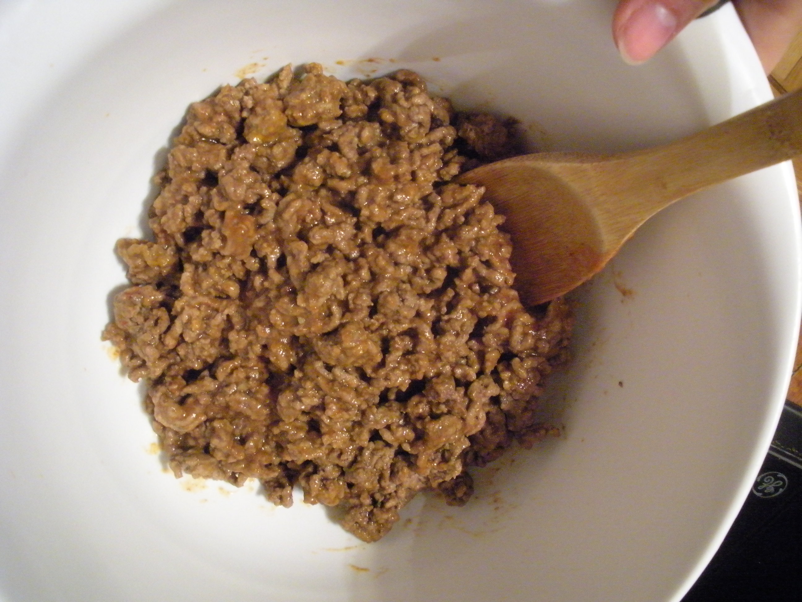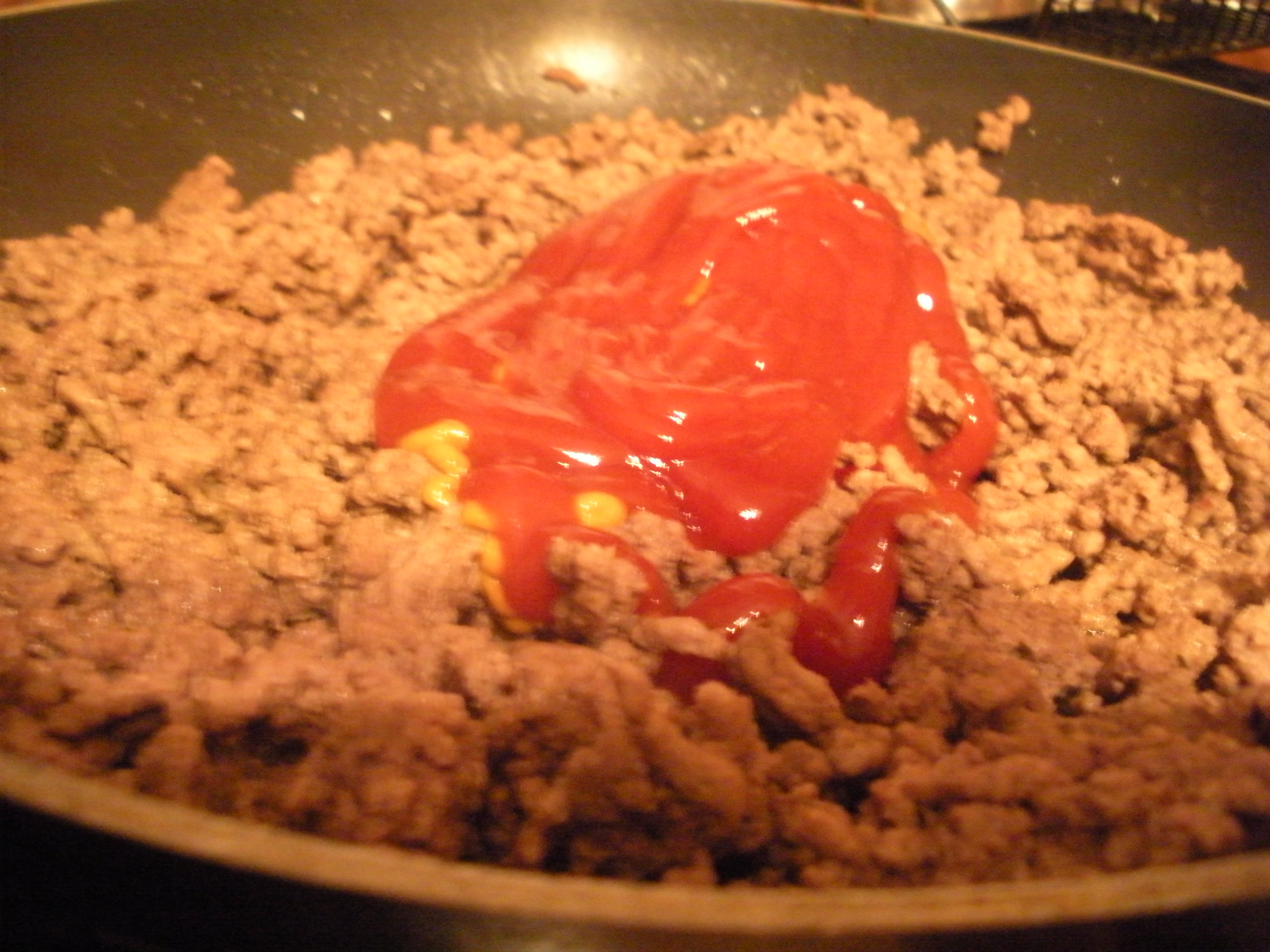 Once the water’s on the stove, start browning the sirloin, breaking it apart as it cooks. Once the meat is browned, remove it from the heat, drain off as much grease as you can/want to, and then add the salt, pepper, ketchup and mustard.