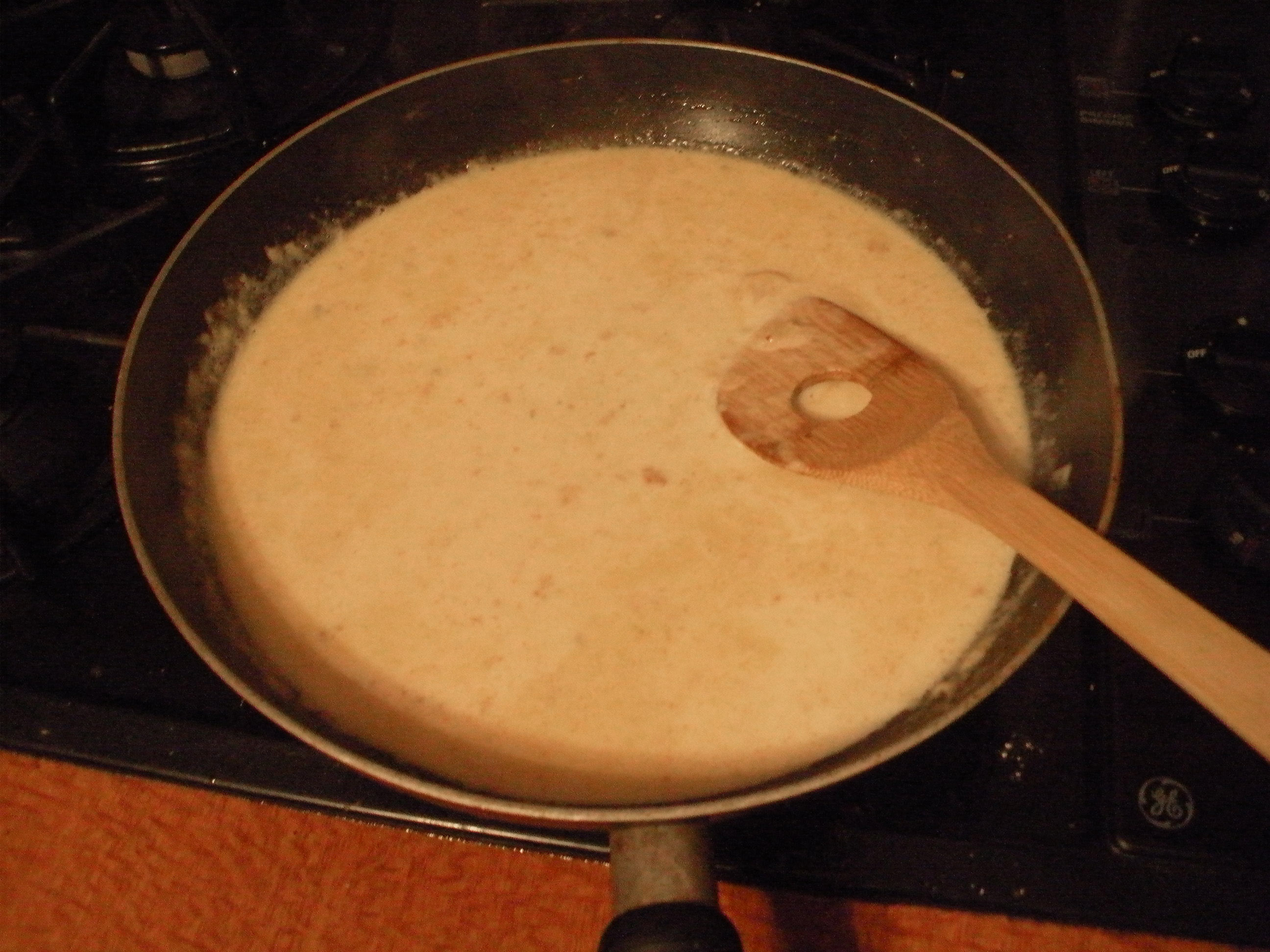 Put the skillet you used for the meat back on the stove and melt your butter in it. Whisk in the flour, and then slowly pour the condensed milk in. Bring to a simmer and cook 2 minutes, scraping the bottom of the pan frequently.