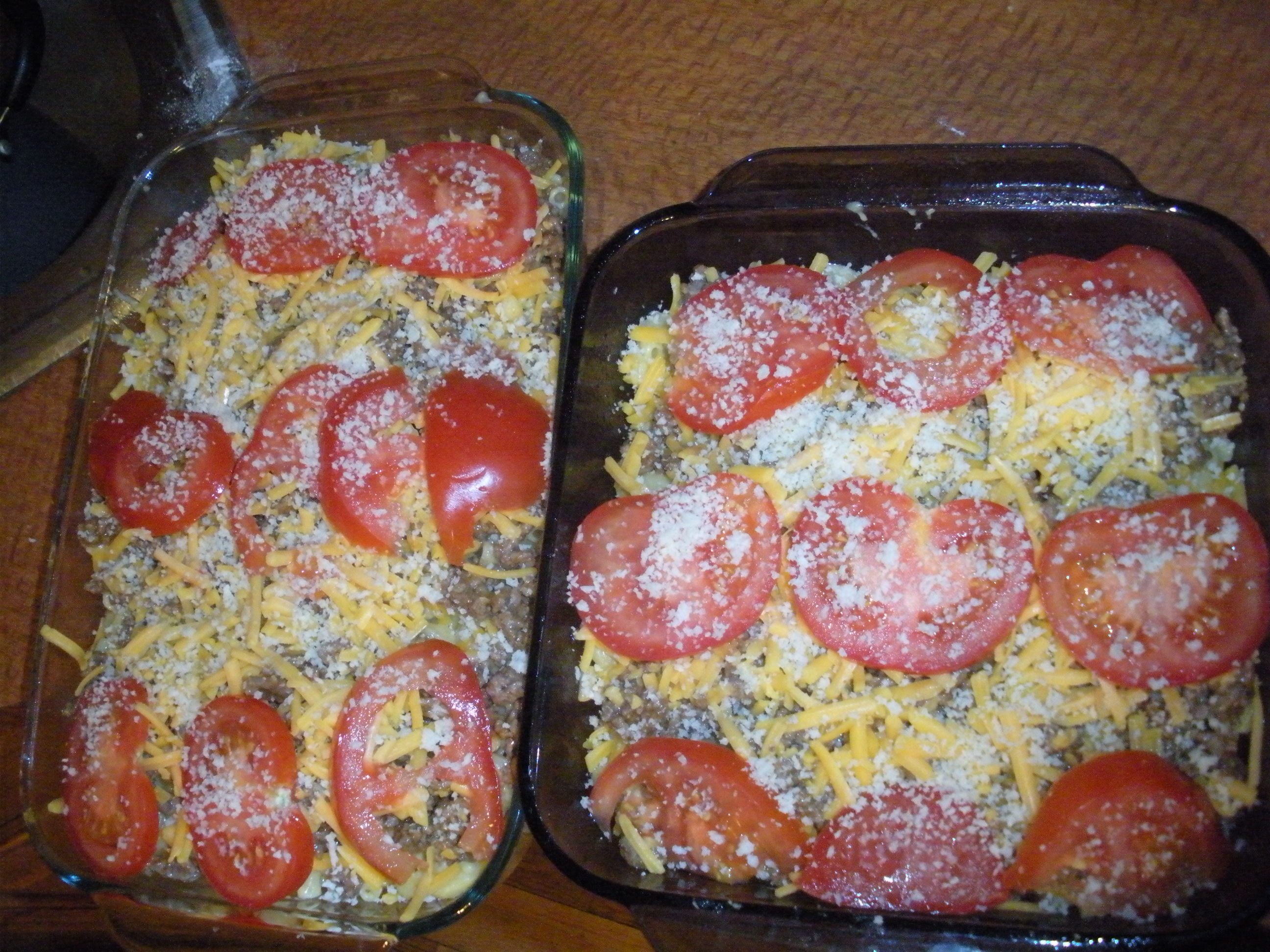 The recipe I followed claimed you are supposed to use a 2 quart dish. I don’t know if she has a SUPER deep 2 quart dish or what, but when I was eyeballing the cooked macaroni and meat, it looked like way too much to fit in one 2 quart dish, so I added an 8X8″ dish as well, and it seemed like a good amount, but meant there was more surface area so we were short on the tomatoes that cover it. You live, you learn! I might go for a 5 quart dish next time, or try to find a super deep 2 quart one?