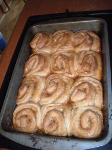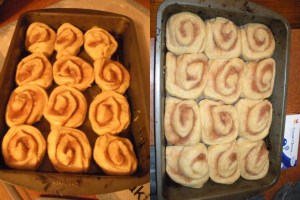 Roll the dough up tightly from one of the long sides, keeping the dough taught to prevent leakage. Cut the roll into 12 slices. Pinch one side of each roll closed, to hold in the filling, and lay them in the pan, pinched side down. Cover the rolls and allow them to rise for an hour, or until nearly doubled. You can refrigerate the rolls at this point for up to a day, just give them an hour to rise the next day between the fridge and the oven.