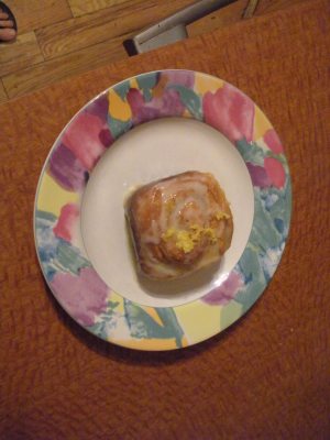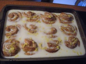 When the rolls are done, smear them with the cream cheese glaze, and sprinkle the final remaining lemon zest over top to garnish. Let cool for at least 10 minutes before serving, but do serve while still warm.