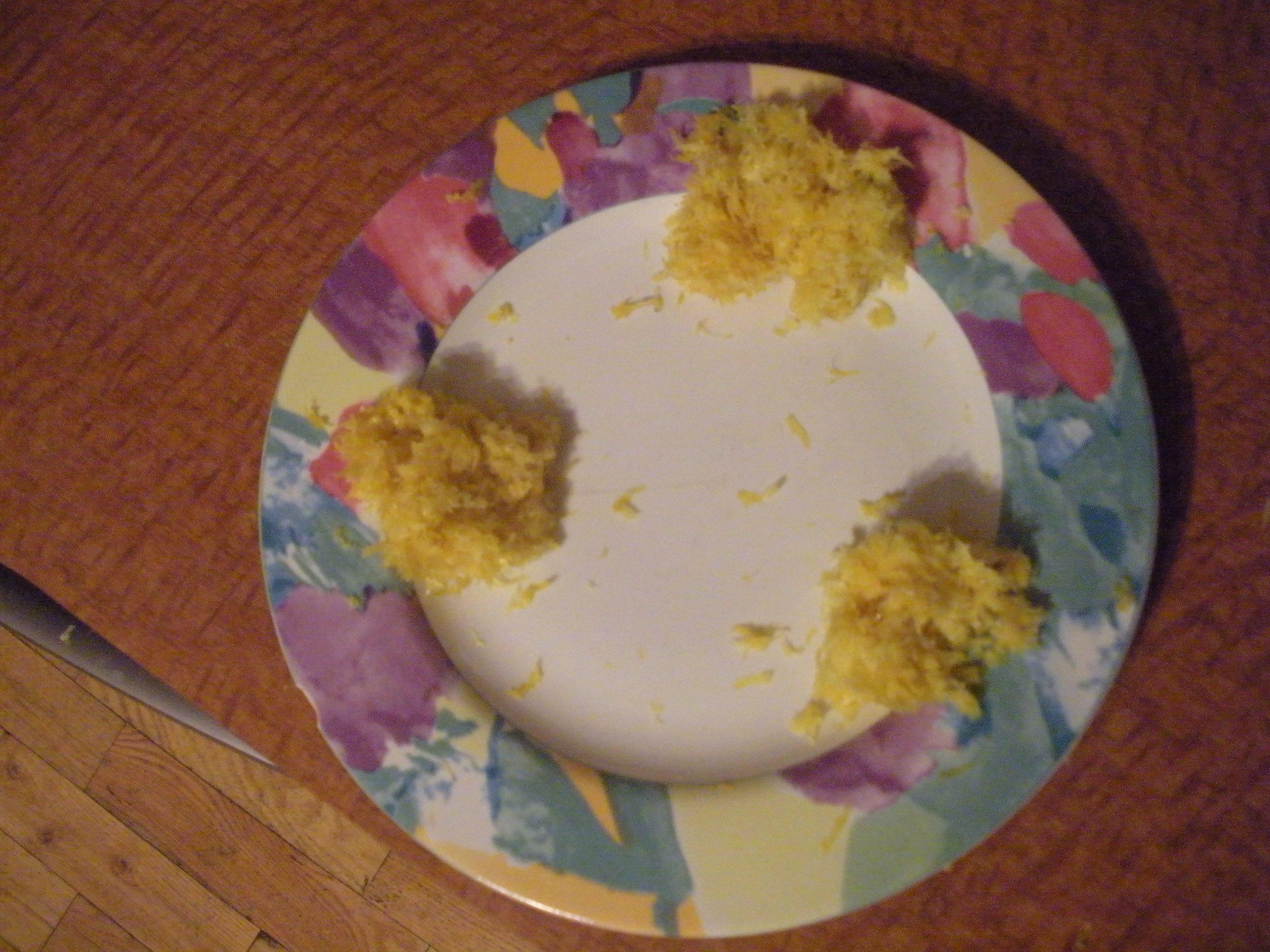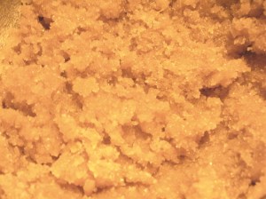 In the last 5 minutes of that hour, make the filling. Begin by mixing together sugar, nutmeg, and ginger. Using your fingers, combine the second portion of zest by rubbing it into the sugar mixture until it resembles soft sand. Slowly pour in lemon juice, stirring, until the sugar is a wet, clumpy mixture. This took muchless than half of the lemon juice for me.