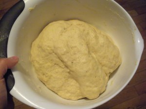 Turn the dough out to a lightly floured surface and knead 5-7 minutes, until smooth and pliable. Place the dough in a greased bowl, rotating so that it gets greased on all sides. Cover with plastic wrap and let rise until nearly doubled, about an hour.