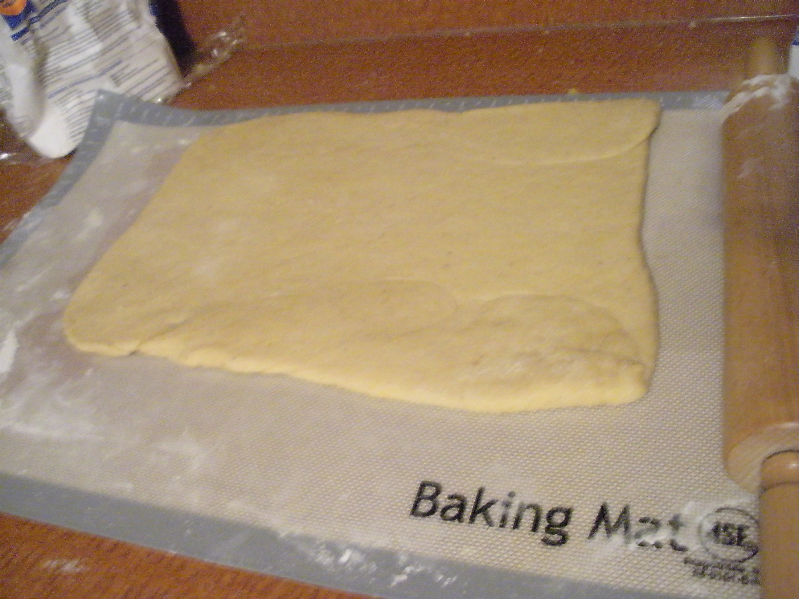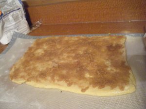 It’s then time to assemble the rolls! Start out by greasing a 9X13″ dish. Turn your risen dough out again onto a lightly floured surface and pat/roll it out to a 10X15″ rectangle. The dough will still be thick.