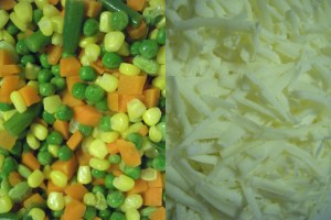 Begin boiling the pasta according to package instructions, and preheat your oven to 350 F. Grate 2 1/2 cups of the cheese, and put 2 cups in with the beef. Add the frozen vegetables, ketchup, and 3/4 of the pasta sauce in the bowl and mix until well combined.