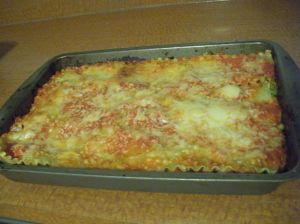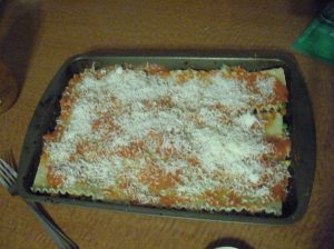 Spread enough of the remaining pasta sauce, just a few spoonfuls, in a 9X13″ dish, to put a very thin coating of sauce in the bottom of the dish. Lay down the first layer of noodles, followed by half of the filling. A second layer of noodles, the other half of the filling, and top with a last layer of noodles. Spread the last few spoonfuls of sauce on the top, and top with the half a cup or so more cheese.
