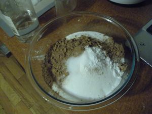 The cake part is just as easy. Combine all the dried goods in one bowl. Realize that bowl is not going to be big enough to stir in.