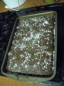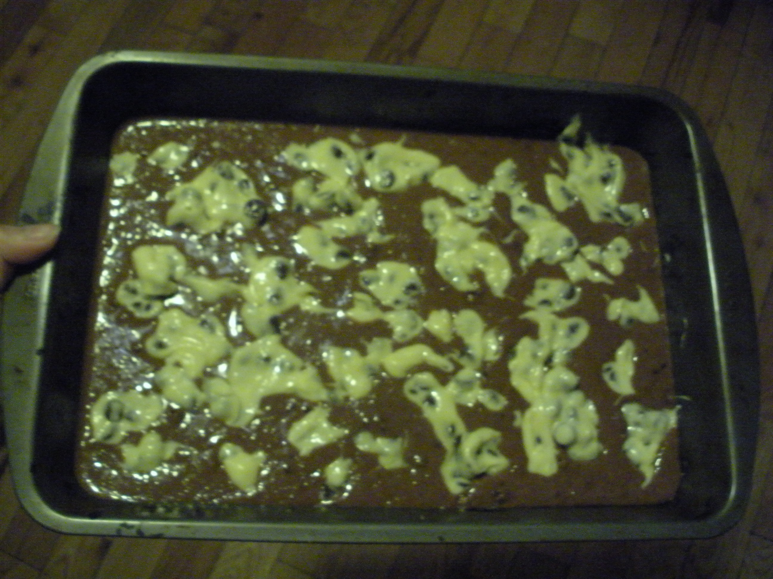 Pour half the batter in a greased (I might do greased and floured next time) 9X13″ pan and then spread the filling over the top of the batter.