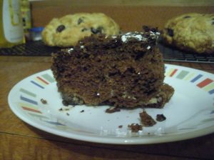 The cake’s got a good, solidly chocolate flavor, and as I said before the filling tastes to me of cookie dough. Two great tastes that taste great together!