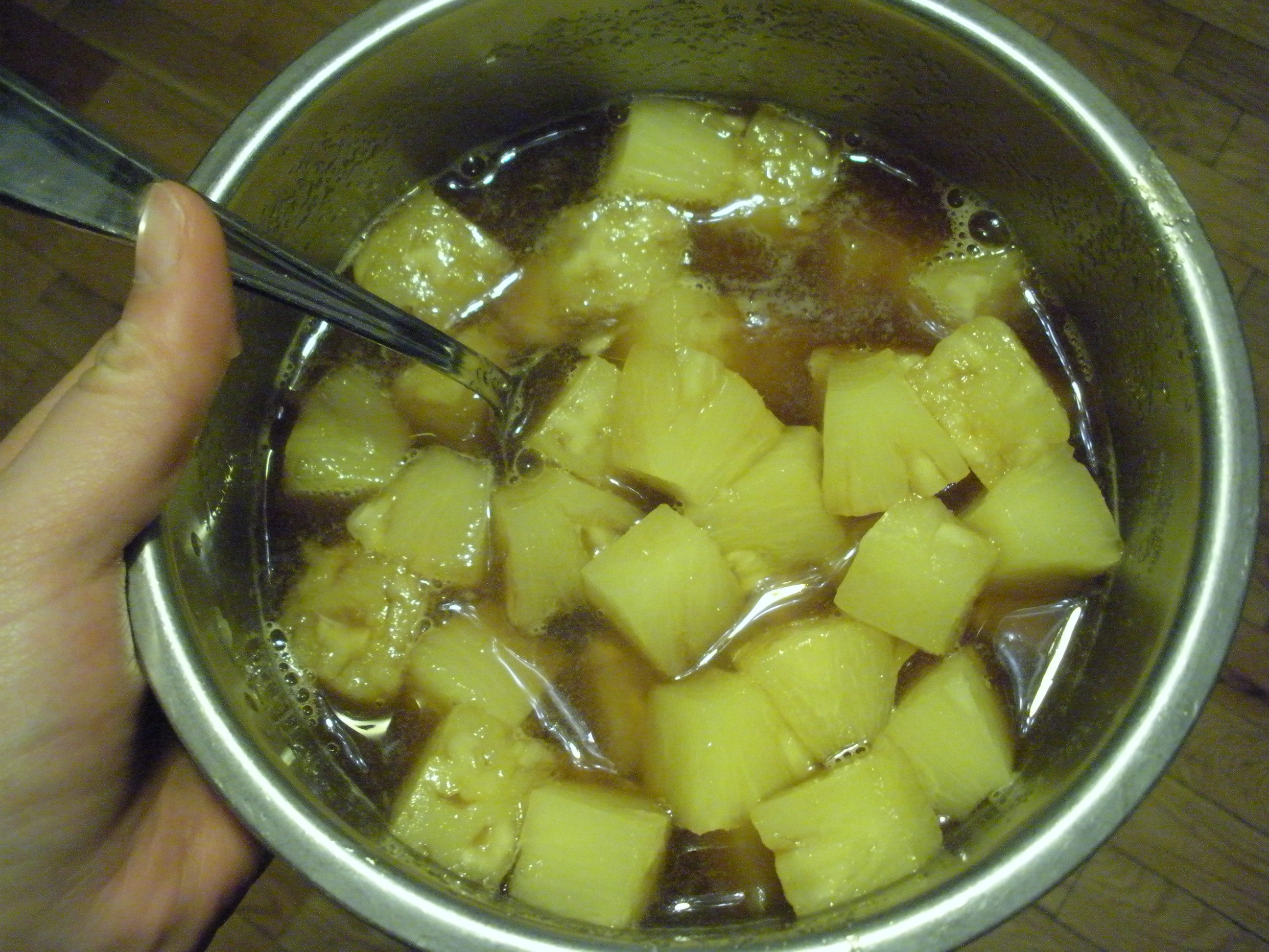 Start off by combining a can of pineapple chunks with a bunch of brown sugar, and stirring until the sugar is dissolved in the pineapple juice.