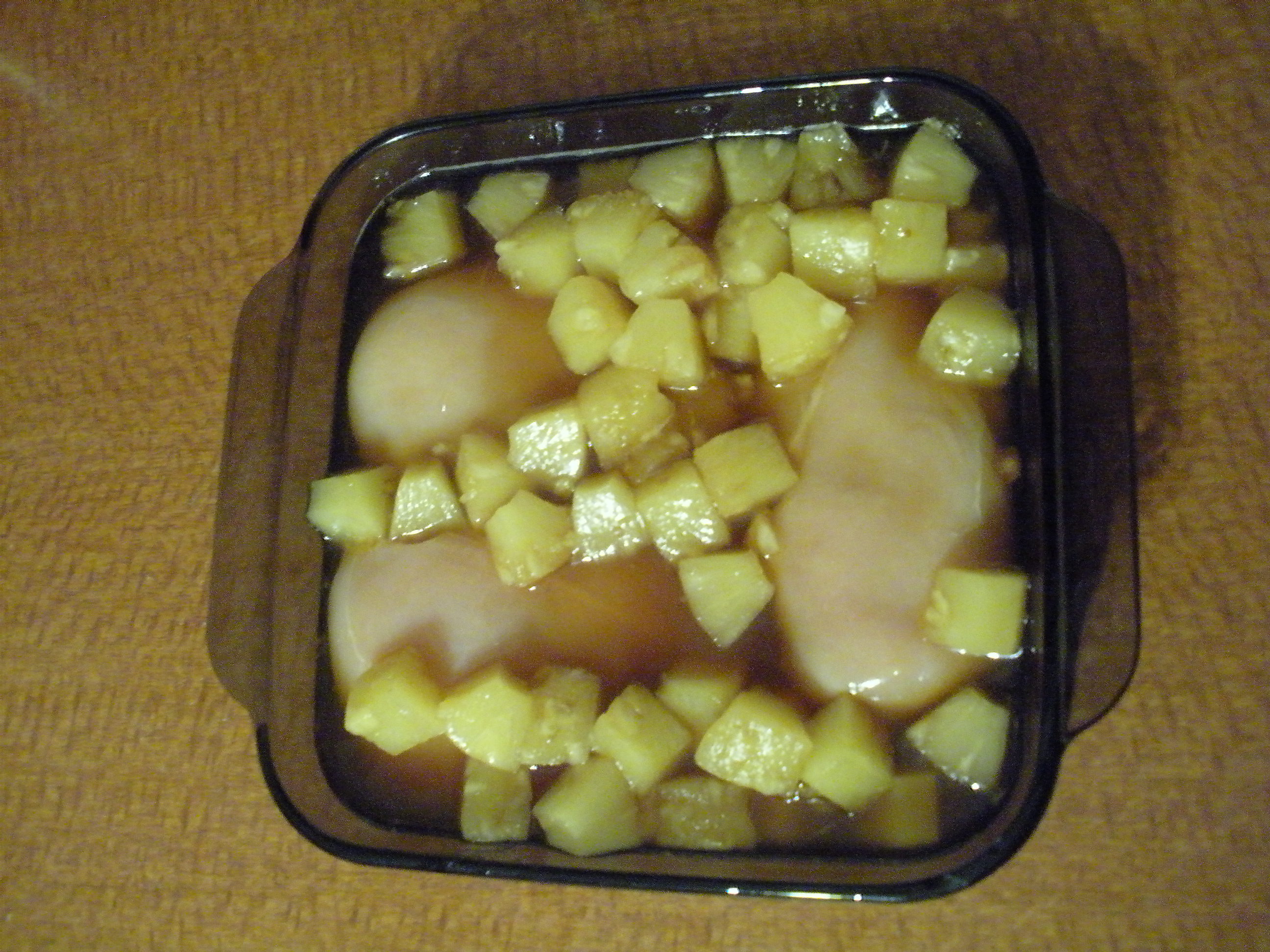 Place your chicken breasts in an 8X8″ baking dish. Cut off any particularly massive/offensive chunks of fat, but otherwise leave the breasts whole. Pour the pineapple/brown sugar mixture over the chicken.
