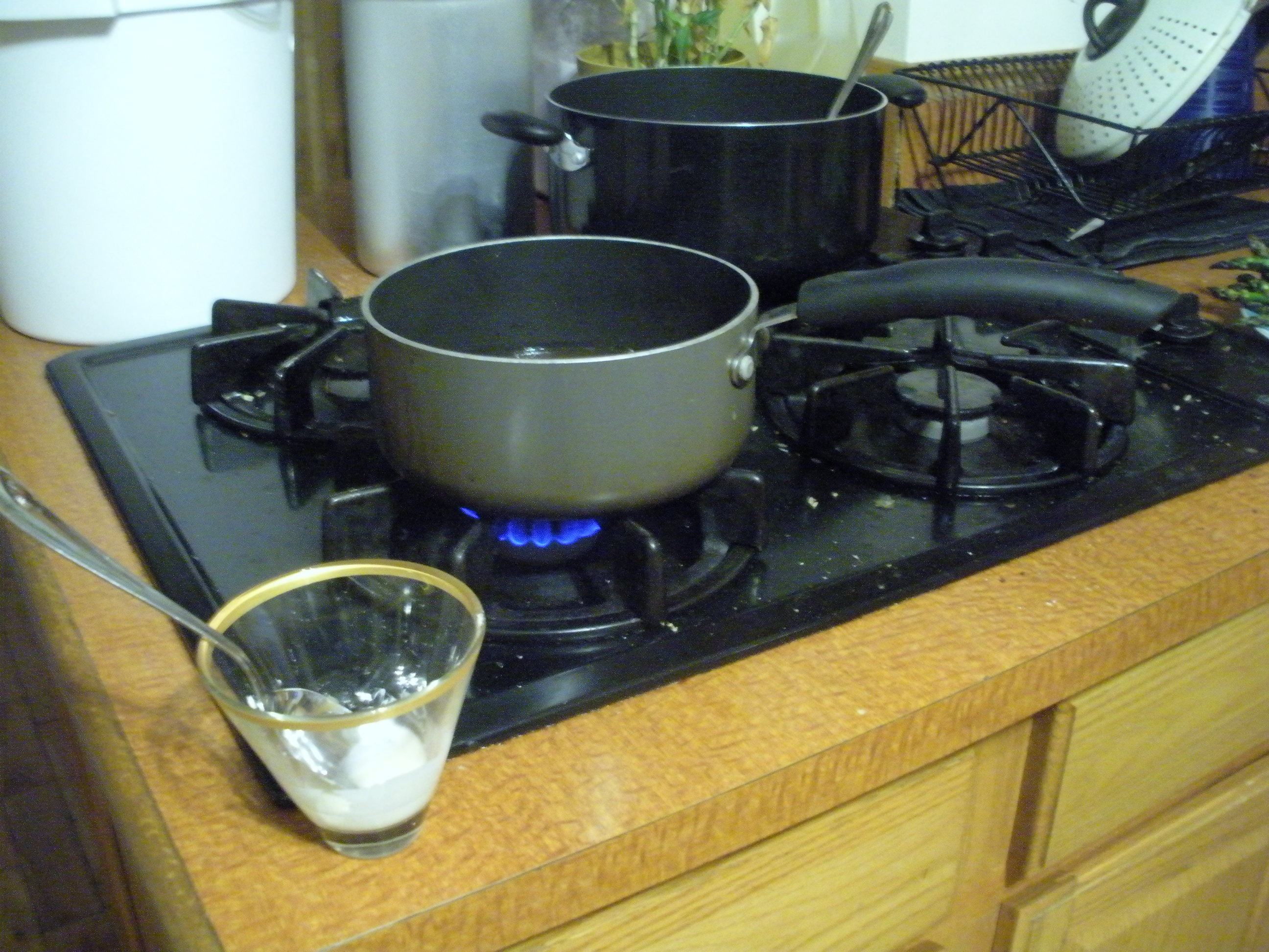 If you’re not too familiar with cornstarch, don’t pour the powder straight from the box into anything you’re trying to thicken – it’ll just clump up. Instead, put a tablespoon or so (really, don’t bother measuring, it’s not that important) in a cup and mix in a small amount of cold water – just enough to be able to wet all the cornstarch. Stir that up, and then spoon into the liquid you’re thickening and it’ll do the job.