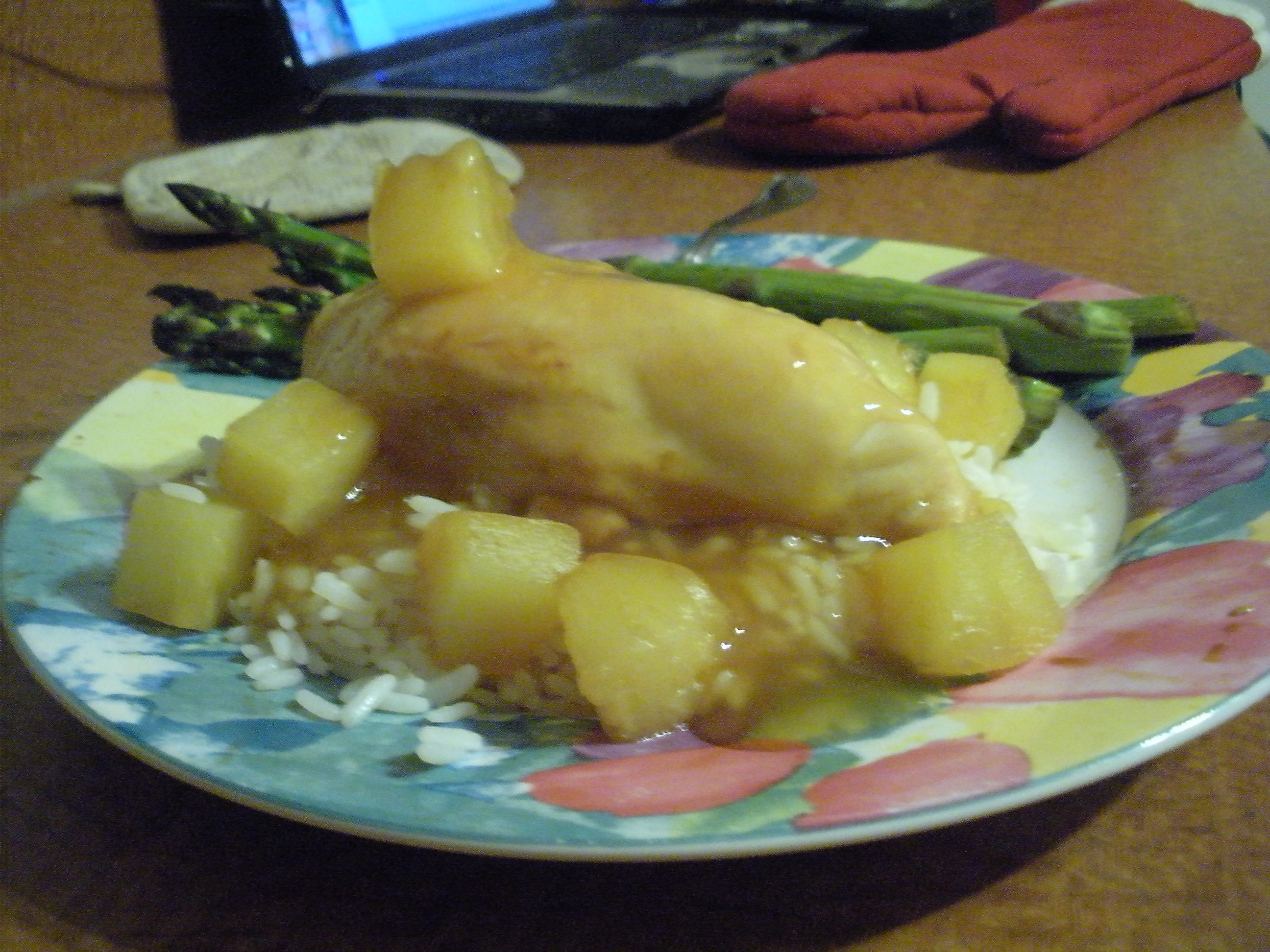 Serve chicken over rice, and top with pineapple sauce.