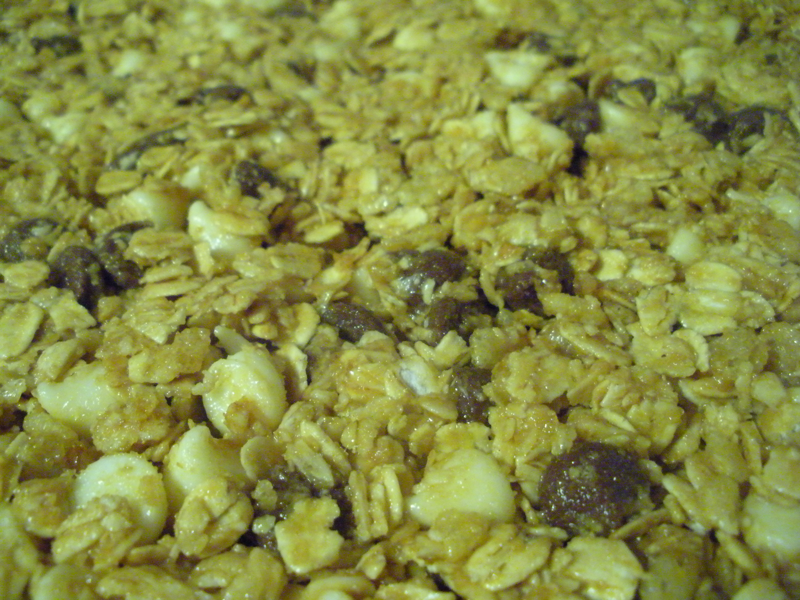Preheat oven to 325 and lightly grease a 9X13″ pan. Stir together all ingredients and press into pan. Bake 10 minutes and then press down the granola firmly. Bake another 10, press down again, and cool 10 minutes. Cut into bars, press down firmly once more, and then cool completely.