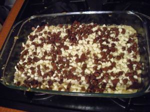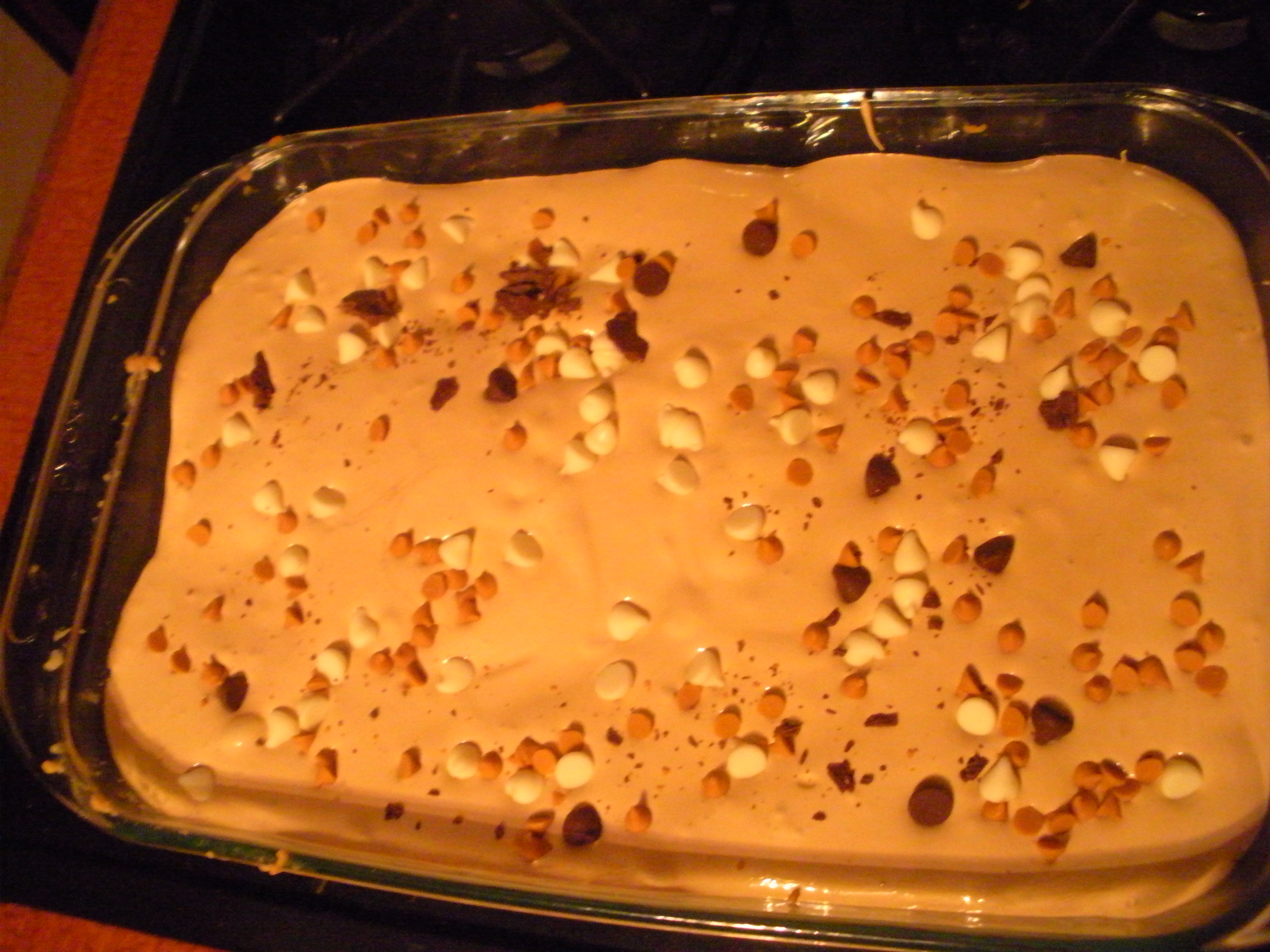 Once you’re done beating the meringue, spread it over the chocolate chip-covered crust, and sprinkle the remaining quarter cup of chocolate chips/nuts on top. I’m embarrassed to admit, but I actually ran out of milk chocolate and had to supplement with white chocolate and butterscotch chips. I like butterscotch, so no huge loss there!