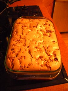 I took mine out of the oven and left it out to cool, fell asleep, and didn’t cover it until the next morning, so it sort of collapsed, but is still delicious.