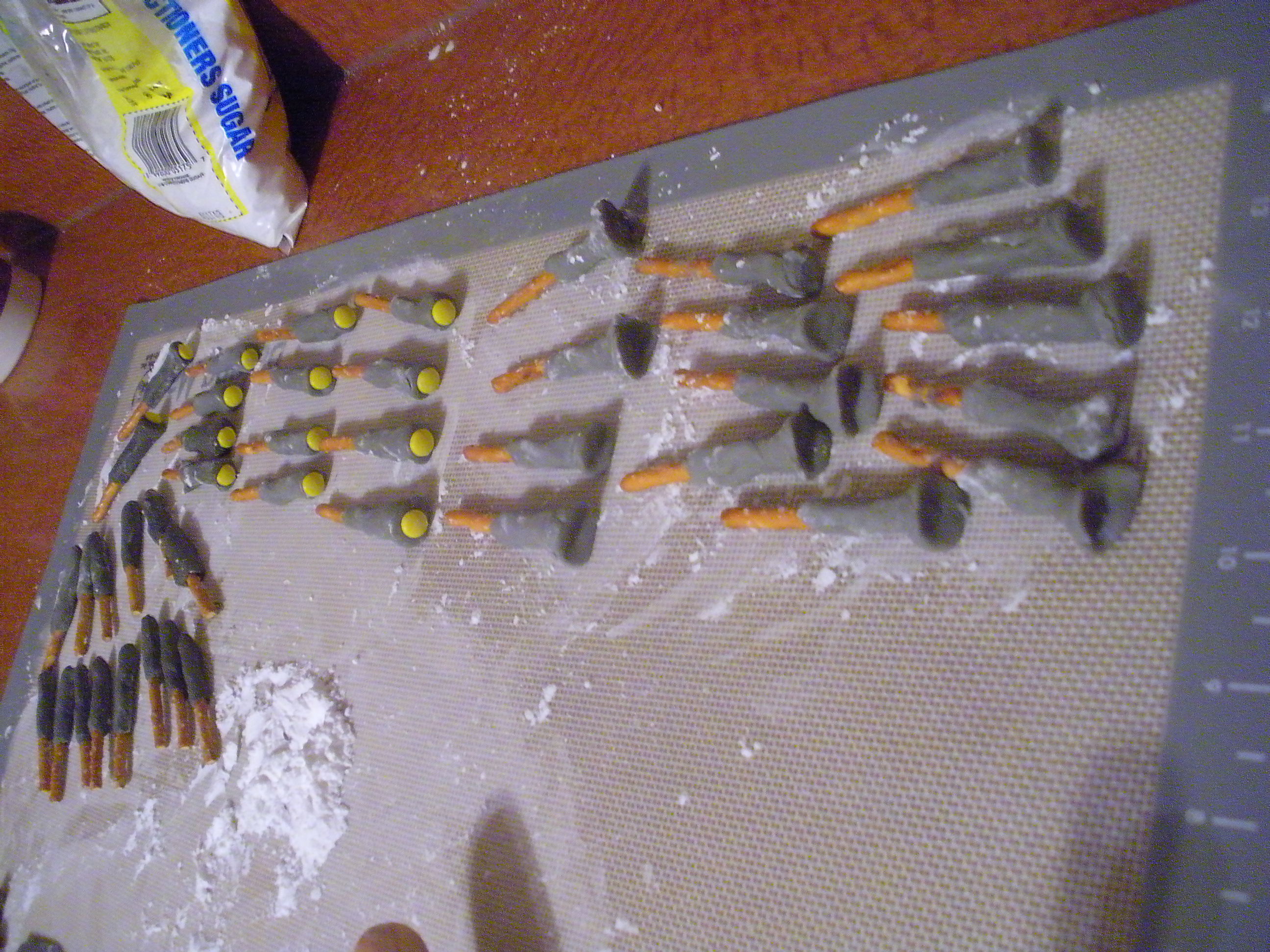 Then I stabbed in the pretzels in roughly the right places and attached the light antenna doo-dad M&Ms to the top with little drops of water.