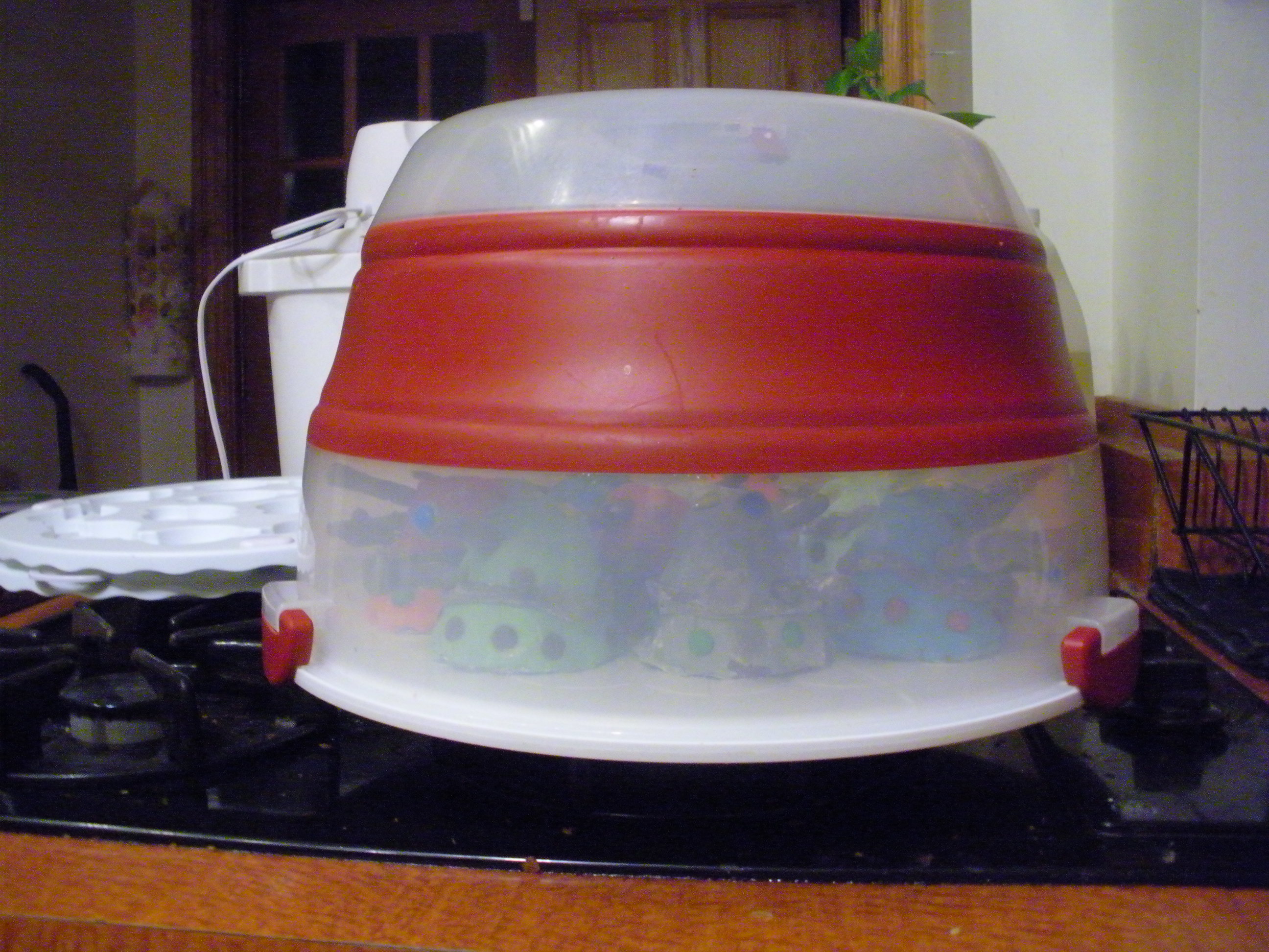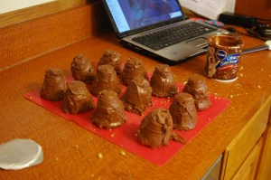 Leaving the grey fondant aside, I made a few other colors, rolled it out, and covered the cupcake…piles. Partly because I was afraid of running out and rolled the fondant too thin, partly because the cupcakes were crumbly/lumpy, and partly because I just haven’t had much experience with this stuff, they were kinda wrinkly. Ah well. Went back to the grey, and rolled out the middle band that goes around Daleks.