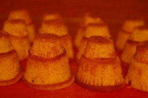To start off, I made a dozen cupcakes and a dozen mini-cupcakes. I cut off the rounded tops so that they’d lay flat upside-down.