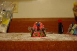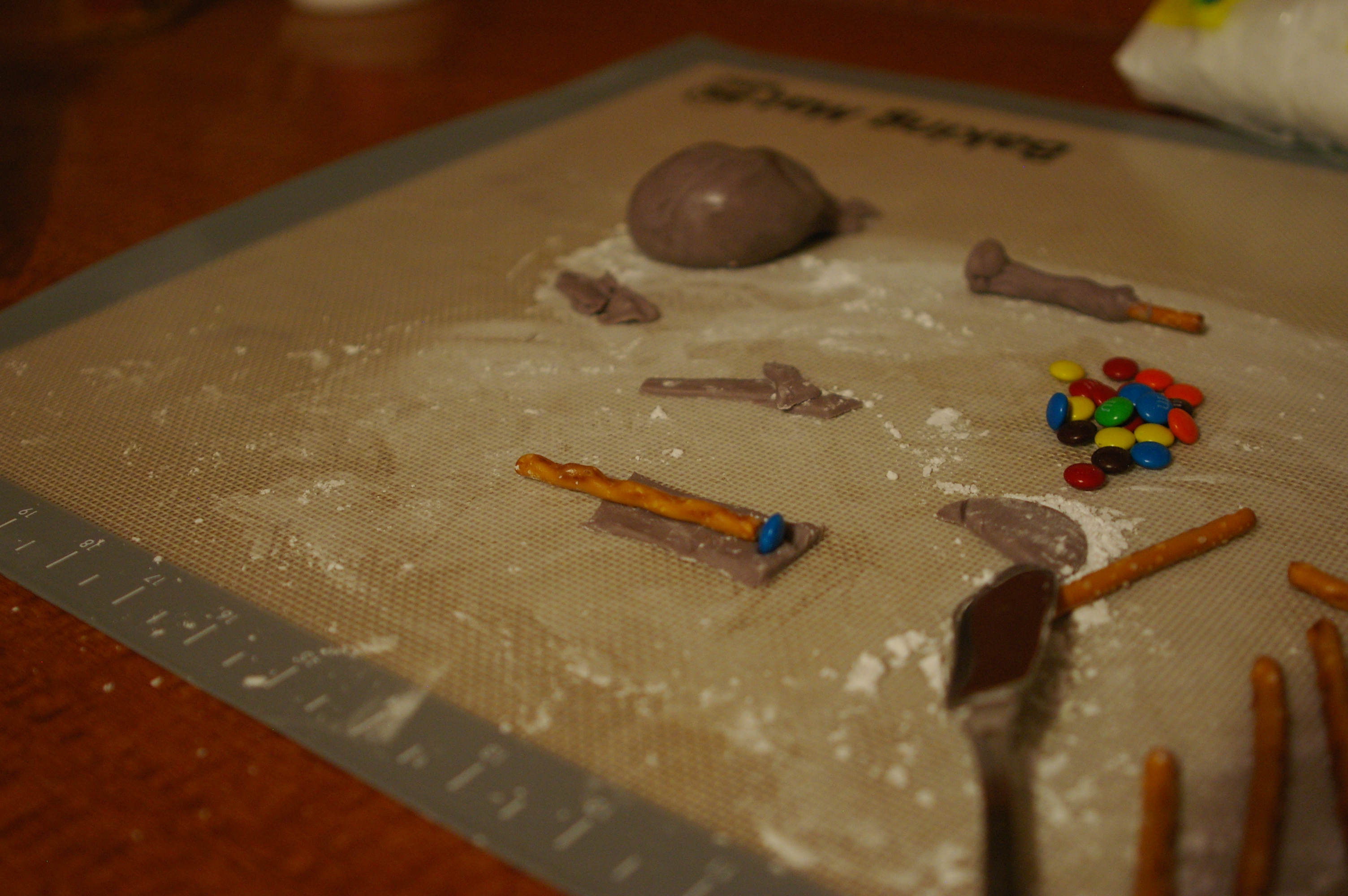 I tried using mini-M&Ms to give some shape to the plunger arms, but in the end it was easier to just use another blob of fondant.