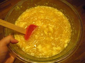 Peel and grate the pears, enough to get 2 cups. It took about 2 1/2 pears for me. Keep in mind when you’re choosing where to grate that this will get juicy. Combine the grated pear, butter, eggs, sugar, and vanilla. Stir to mix well.