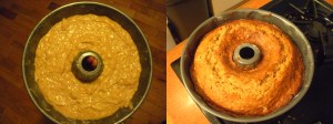 Pour into a greased bundt pan (or two bread pans) and bake until browned and firm on top, and a wooden skewer inserted in the center comes out clean.