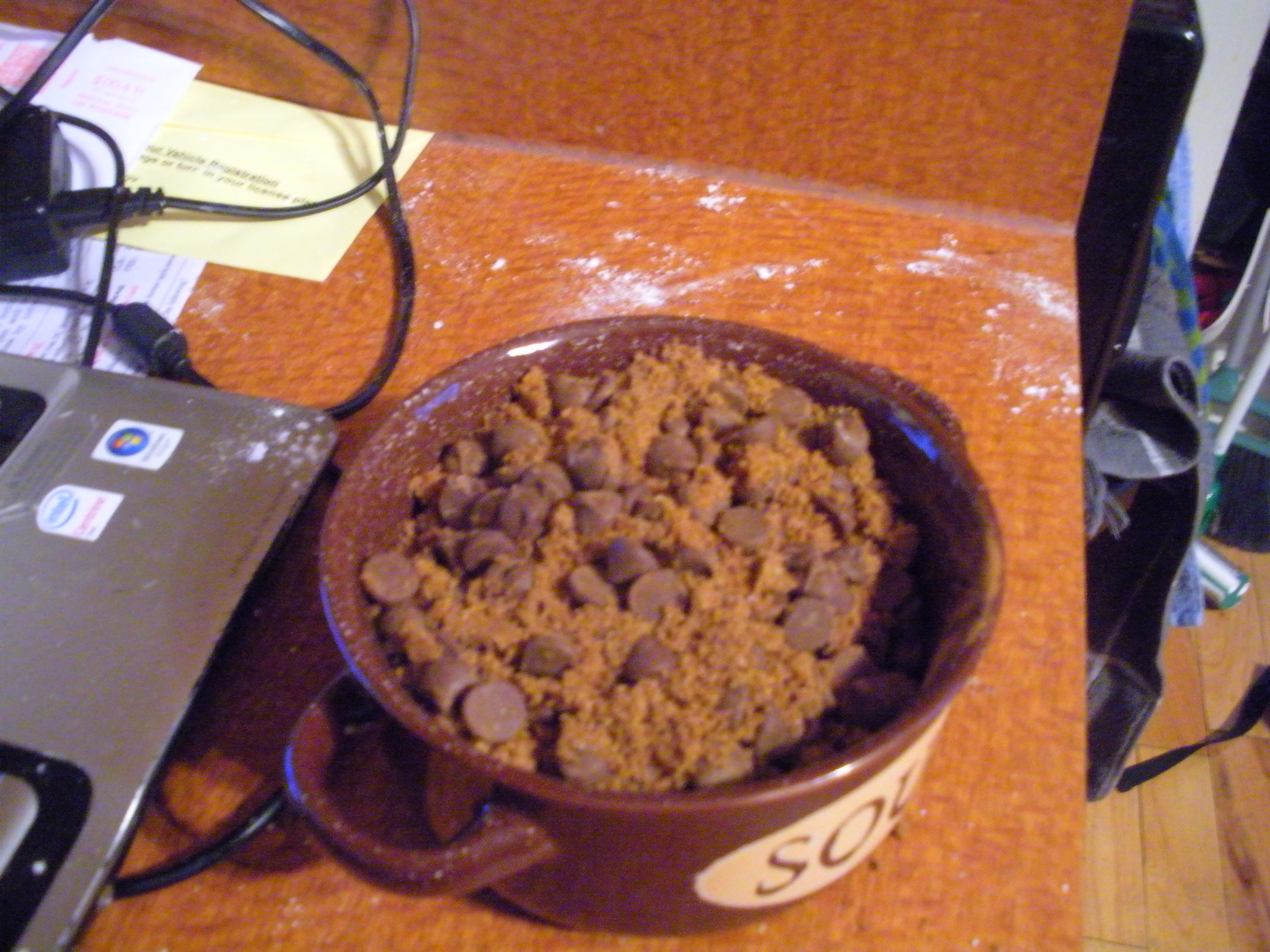 Begin by greasing and flouring an 8X8″ pan. Make the streusel by just mixing the ingredients together, and then set it aside. You could use chocolate chips and walnuts, but that’s gross so I just used even more chocolate.