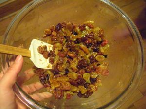 At the end of the hour, drain the water and pat the raisins dry. Mix them in a medium bowl with the honey, cinnamon, and lemon zest, then set aside.