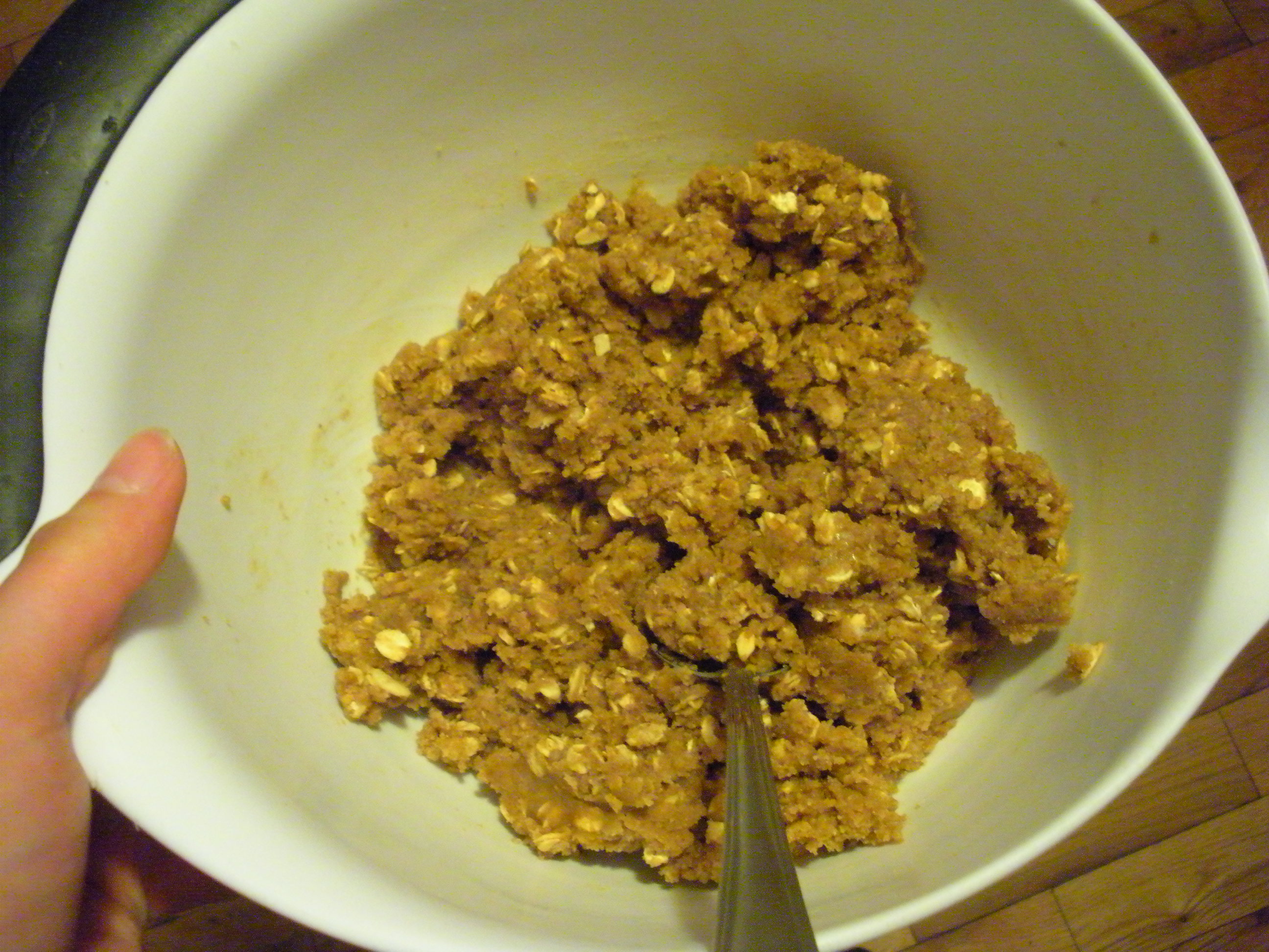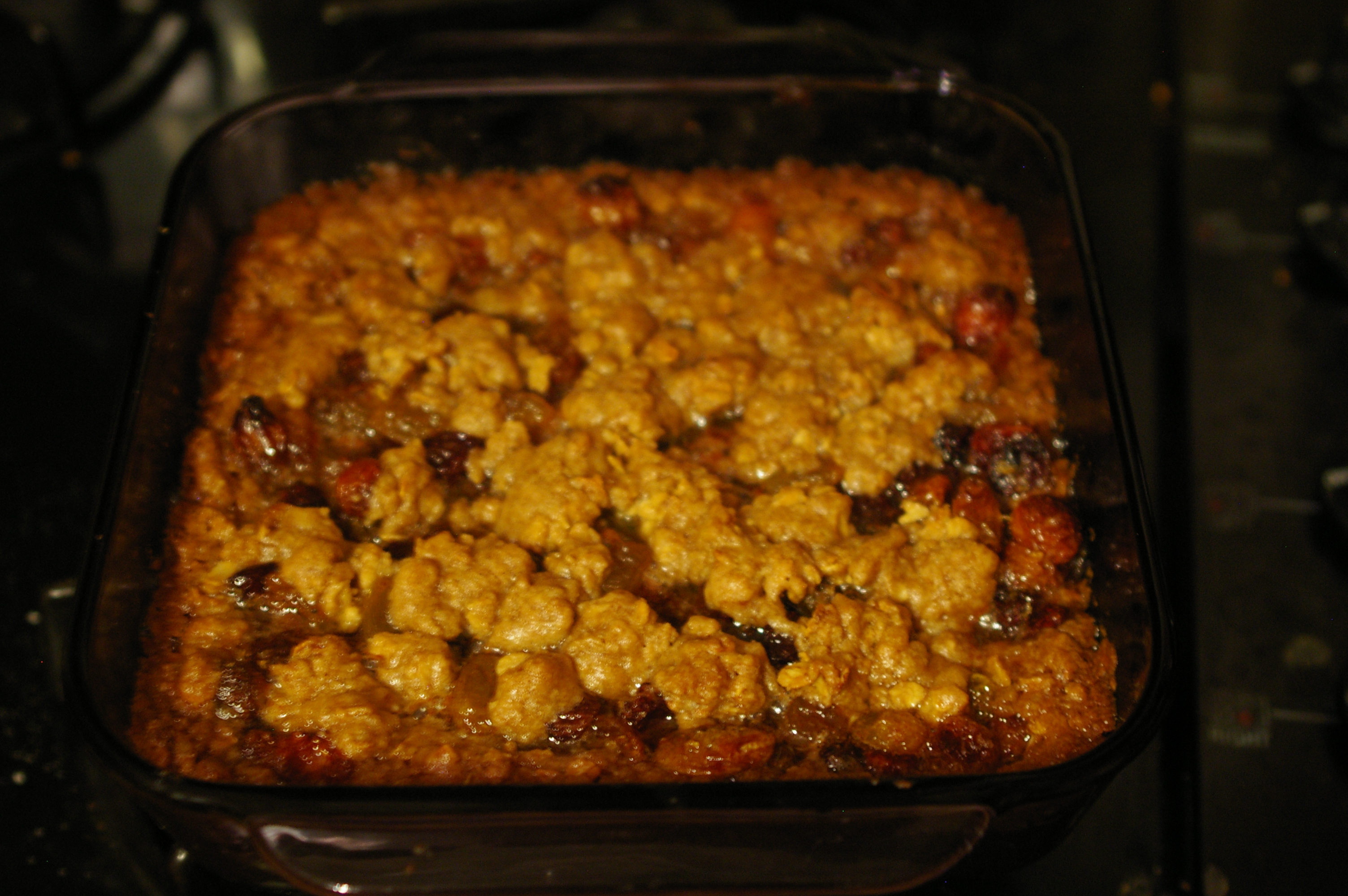 Pat 2/3 of the dough into the bottom and an inch up the sides of a greased 8″ square pan. Add the filling, spreading evenly, and then crumble the remaining dough over the top. Press the crumbles gently into the raisins, and then bake until golden.