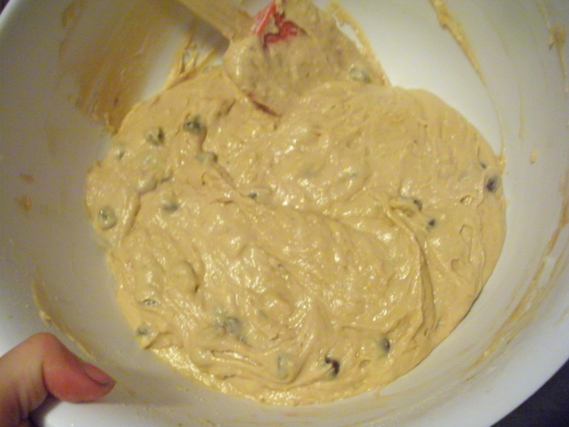 I had to make one substitution with this recipe because it calls for a cup of chocolate yogurt or sour cream, and I couldn’t find chocolate yogurt, or chocolate extract, at either of the two supermarkets near my house. Instead, I put a teaspoon of cocoa powder and a tablespoon of sugar in a 1 cup measuring cup, and then filled it the rest of the way with plain, unsweetened yogurt. I didn’t bother mixing and tasting that to see how good it was as chocolate yogurt, but it was fine in the muffins. You could actually probably bump up the cocoa and sugar a bit if you want a chocolate muffin with chocolate chips, as I don’t actually taste the cocoa much at all in the final muffin. Or, y’know, just find chocolate yogurt in the first place? Anyway…