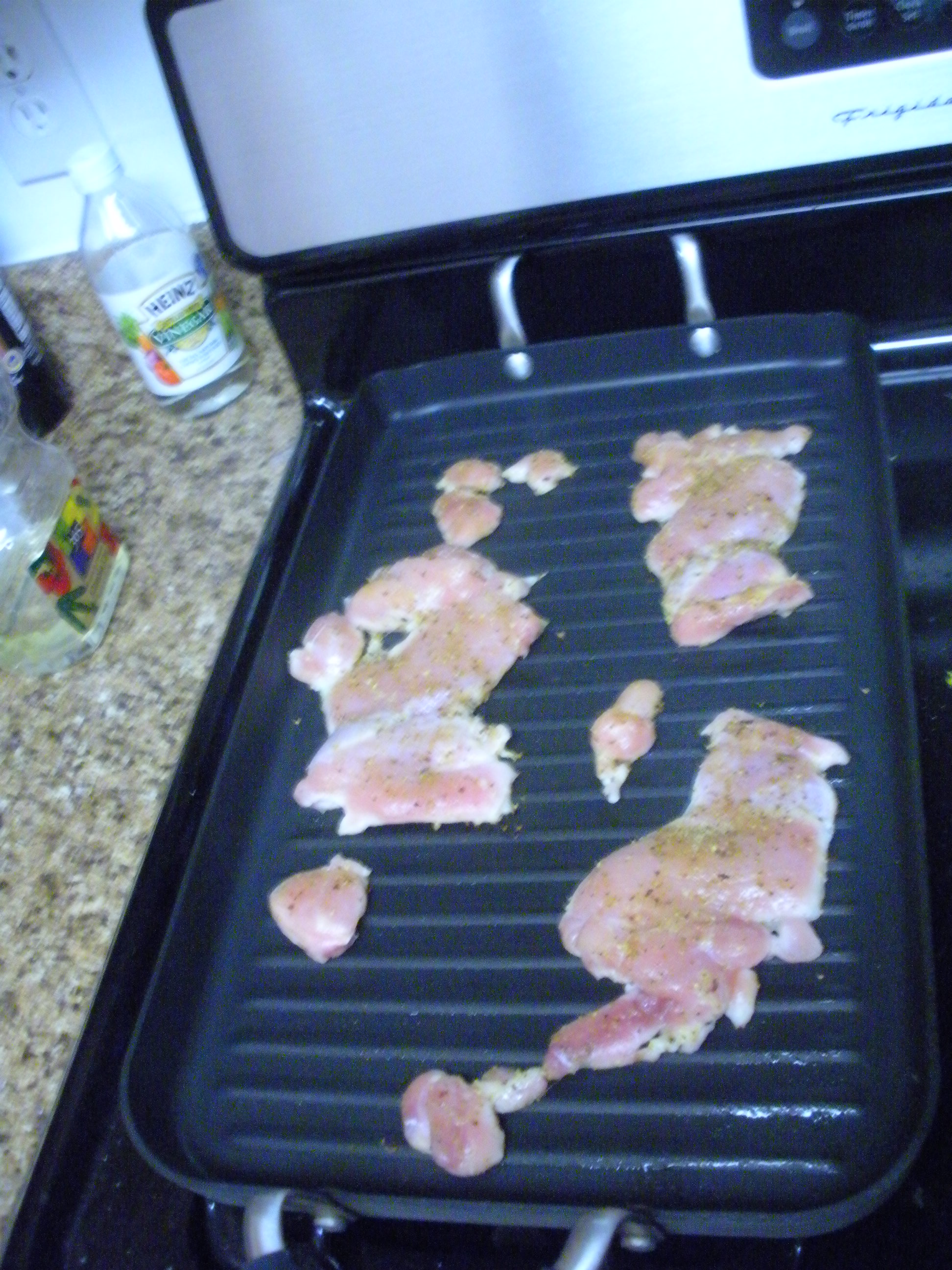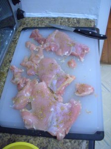 - 1 1/4 pounds boneless chicken thighs (Cooking Light thinks that that’s 8 thighs, but it’s about 4 if you’re using non-organic, store brand, saline-pumped ones)