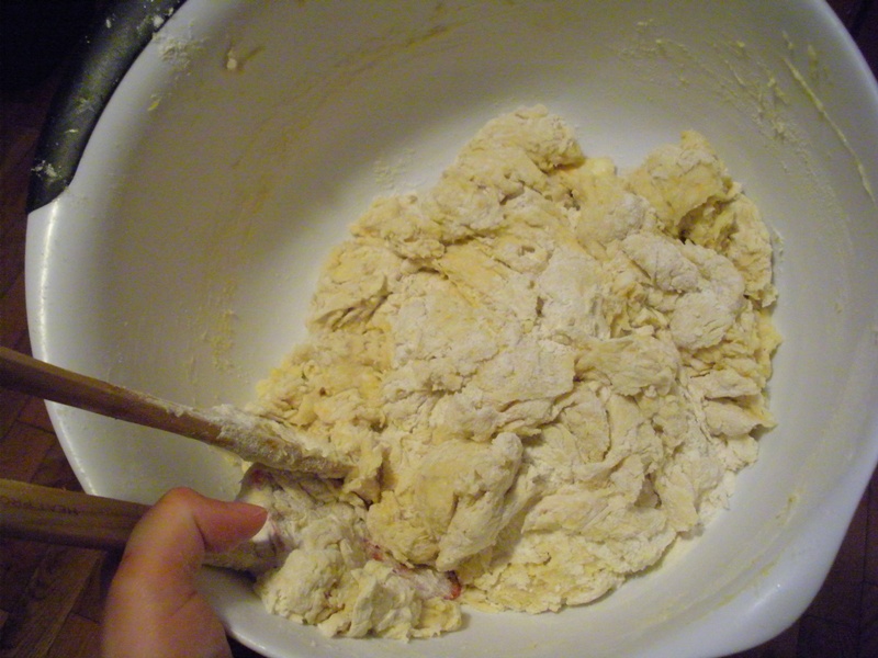 Combine the water and yeast in a large bowl. Dissolve the best you can, but it’s not very much water for dissolving that much yeast. Add the milk, shortening, sugar, orange juice and zest, salt, eggs, and three cups of flour. Stir until smooth.