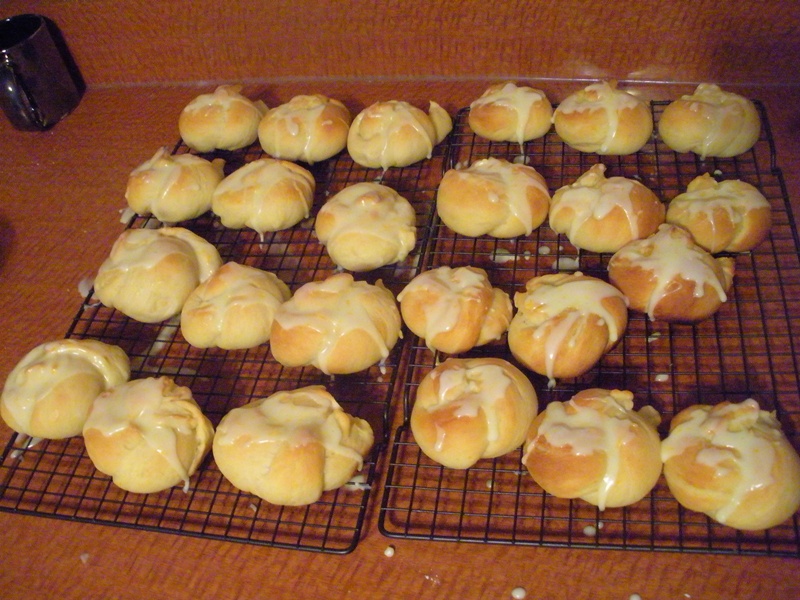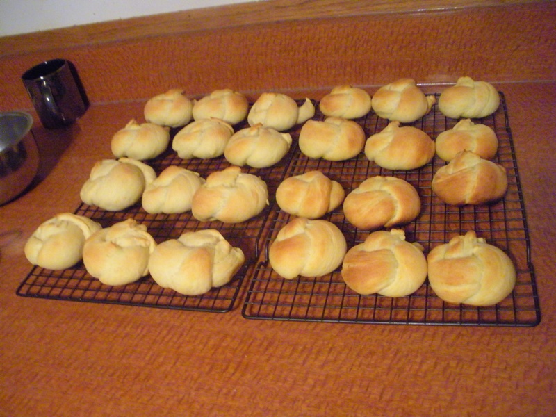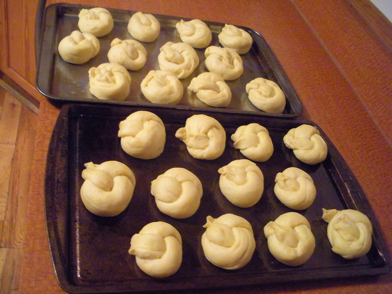 Punch dough down and divide into two. Divide each half into 12 balls. Roll each ball into a 10″ rope and tie into a knot. Tuck the ends underneath. Place on greased baking sheets 2″ apart, cover, and let rise until doubled, about 45 minutes.