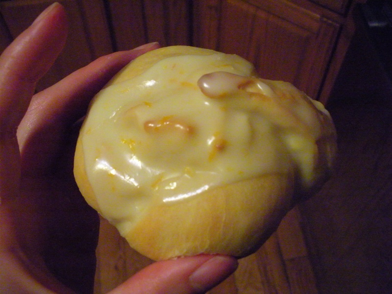 These were originally called Orange Bow Knots. While I was shaping them, however, I sort of forgot the bow part, and just went with the knot, so they’re sort of lumpy knot balls. Despite not being cute, they’re really nice! You can really taste the orange juice in the dough, which hasn’t been the case with some fruit baked goods I’ve tried. They’re really light, and have a tasty glaze. I support it! I might make them again soon with soy milk for my vegan friend that is currently sharing his hemp milk ice cream with me. (Honestly, it’s not nearly as gross as it sounds! Real ice cream is better, but this is fudgey and …as good as vegan things are ever going to be?!)