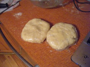 Sprinkle about half of the ice water over the flour mixture and work gently, adding more water as needed until the dough forms a rough mass. Knead briefly and divide dough in half. Press into two disks and wrap each in saran wrap. Chill in the fridge two hours or up to overnight.