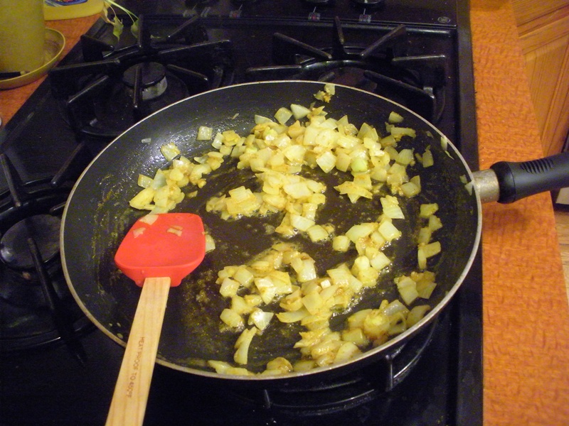 While the dough chills, prepare the filling. Melt the butter on the stove over medium heat. Add the onions and garlic, cooking for two to three minutes until they turn translucent. Add the curry powder and cumin and cook an additional minute. Add the potatoes and turn to coat well in the spices. Mash the potatoes, leaving some chunks if desired.