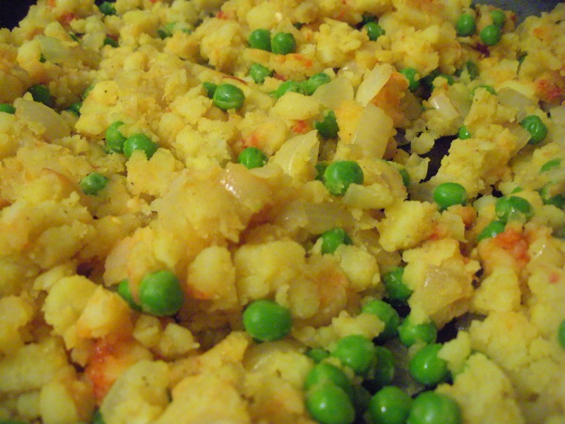 Add the potatoes and stir them to coat in the spices. Break up the potatoes over the heat, cooking for a few more minutes. It’s up to you if you want to mash entirely smooth or leave a small chunks.