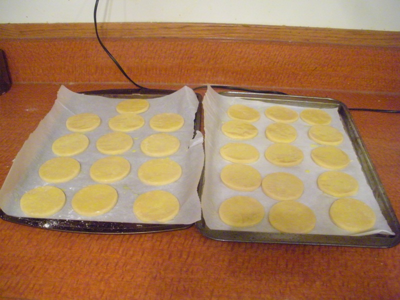 Roll out the dough, one disk at a time, to 1/8″ thick. Cut circles of dough with a 3″ cutter.