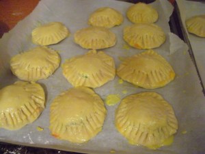 Mix together the egg wash and brush over each circle. Place two tablespoons of filling onto each and fold the dough into half moons. Personally…this seemed like way too much filling for me, I ended up just using two per samosa, one as top and one as bottom. Crimp the edges with a fork, and brush the tops with egg wash.