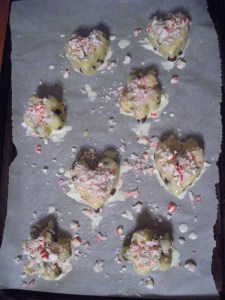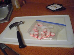 One of those little ‘1 for 59 cents, 2 for a dollar’ bags of peppermints you can get at CVS and everywhere else turns out to be about half a cup when crushed. You can definitely get away with eating one, and sharing with anyone else in the kitchen as well. I crushed up the whole bag, and had more peppermint crumbs than scones to pile them on.