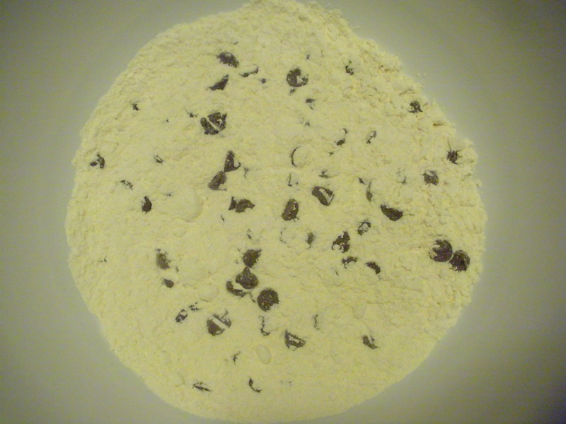 Add the chocolate chips and stir until they are coated with flour and evenly spread through the flour.