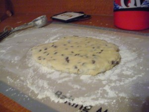 Turn the mixture out onto a heavily floured surface and knead until a soft dough forms. Holding the dough in one hand, re-flour your work surface. Pat the dough into a rough disk, putting it down on the floured surface when it gets too big to conveniently hold. The book said one inch thick, but then shows scones much, much thinner. I’d aim for half an inch thick, max.