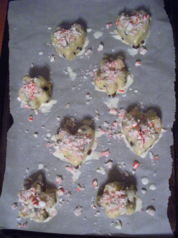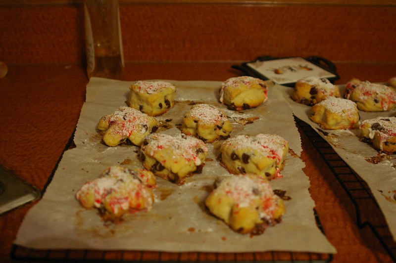 One important tip: The peppermint bits will melt, and some of that will run off the sides of the scone. If there’s melted peppermint hanging on to the bottom of your scone and it’s still white, red, or pink – cool, eat it! If it’s started browning, break that off and throw it out, because WOW that is a lastingly horrid bitter taste. Oof.