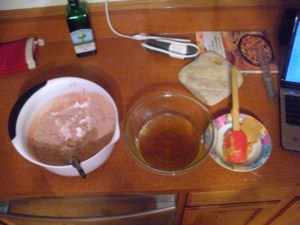 Put all the dry ingredients in a large bowl and stir together, including either of the optional spices, if wanted. I added the cinnamon, but don’t think I really noticed it in the final product. Put all the wet ingredients in a medium bowl and stir together, then pour into the dry goods. Stir until just combined.