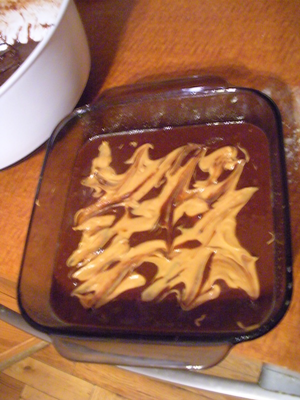 Pour half of the batter into a greased 8X8″ dish. Spread the peanut butter over the batter, without bringing it all the way to the edges of the dish.