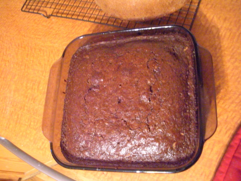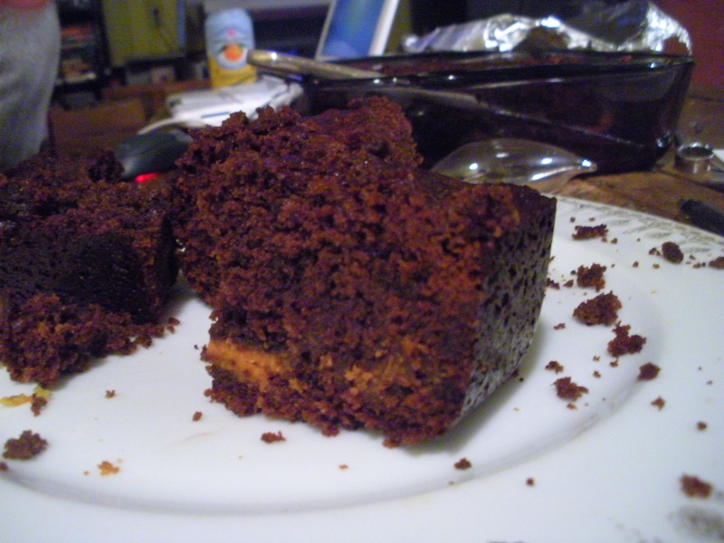 Pour half the batter in the prepared dish, then top with peanut butter. Pour remaining batter on top and bake 35-45 minutes. Cool in dish.