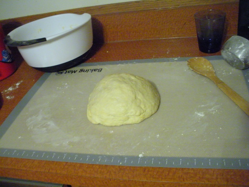 Pour the water in a large bowl and sprinkle the yeast over it. Stir, then let sit 5 minutes. Add the butter, olive oil, salt, sugar, and about 4 1/2 cups of the flour. Pour the other half a cup of flour out on your work surface. Stir the ingredients in the bowl together until mainly held together, then turn out onto the floured surface.