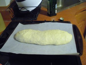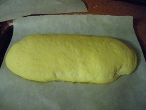 Line a sheet with parchment. Pour a bit of olive oil on the sheet and spread it with a brush or paper towel to cover the parchment. Shape the dough into a long loaf and place it on the greased parchment.