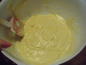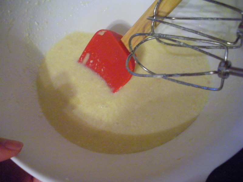 Beat the 1/4 cup sugar, butter, and salt in a large bowl until you can no longer see the sugar. Blend in the milk – it will stay a bit lumpy, that’s ok.