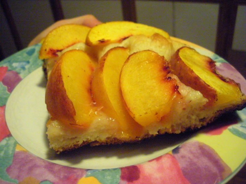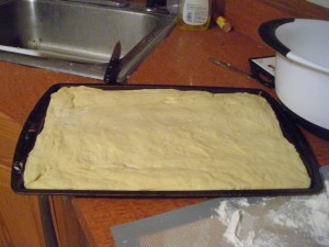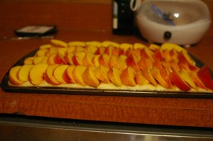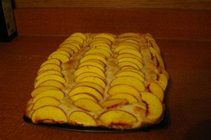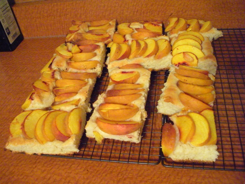 Roll or press the dough to fill the pan. Cover the dough with the peaches, pouring any juice left in the bowl over the fruit. Cover loosely and let rise another hour.